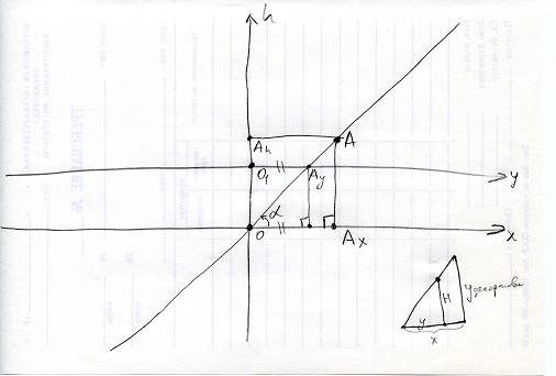 Очевидно, ордината точки A в декартовых координатах равна длине отрезка AAx, равной также длине отрезка OAh, где Ah -- проекция точки A на прямую h. Выразим yдекартова через тангенсальные координаты. Пусть α -- угол между прямой OA и x, тогда тангенс этого угла